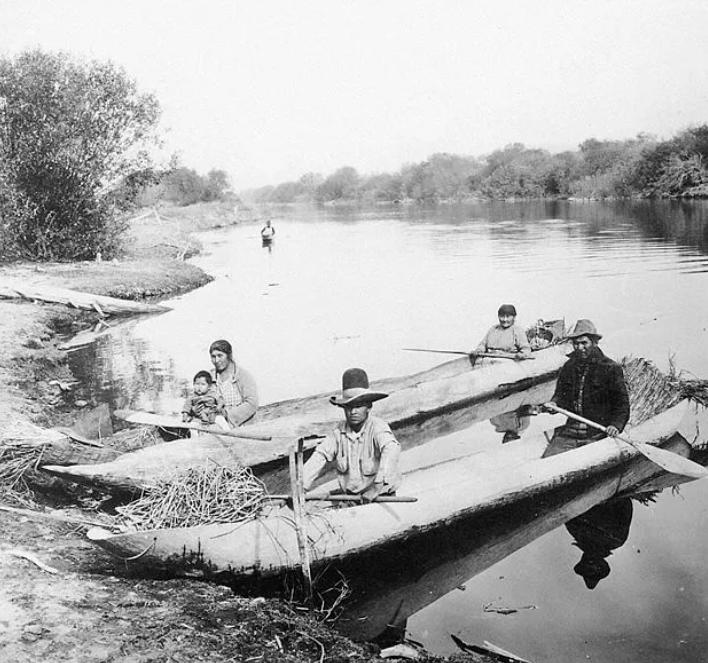 Pictured here, people of the Klamath tribe sit in their dugout canoes.